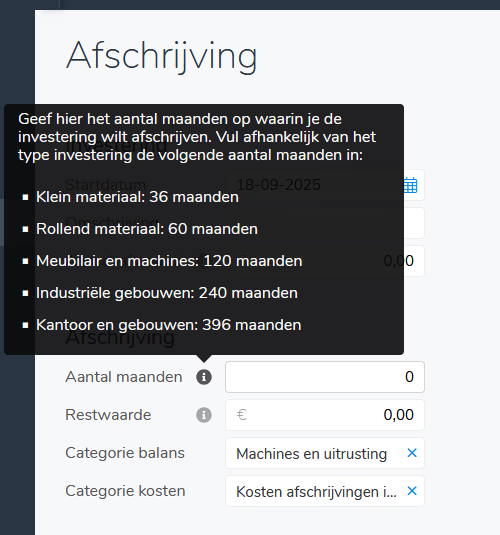 In DigiBoox geef je zelf het aantal periodes voor de afschrijving aan. Weet even niet meer welke voor jou van toepassing zijn? Geen probleem, DigiBoox helpt je bij het maken van de juiste keuze!