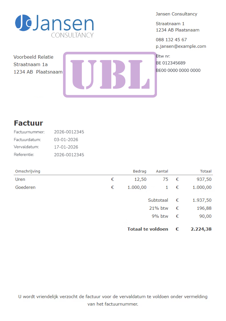 Facturen die je per e-mail stuurt, bevatten automatisch de elektronische factuur. Ook wel UBL-factuur genoemd. Opdrachtgevers kunnen dit (vaak) automatisch inlezen.