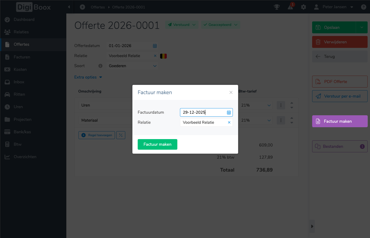 Wanneer je ook offertes verstuurt, kan een offerte met één druk op de knop omgezet worden naar een factuur.
