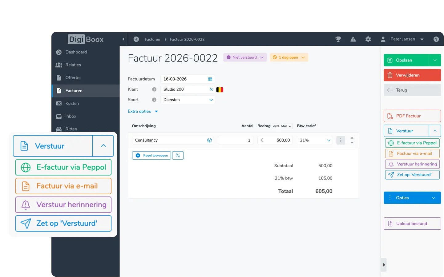 Sinds 1 januari 2026 moeten Belgische btw-plichtige ondernemingen hun B2B-facturen via Peppol versturen. In DigiBoox hoef je hiervoor niets apart in te stellen of te installeren. Peppol is volledig geïntegreerd in het facturatieproces. Zo ontvang en verstuur jij zonder gedoe e-facturen in DigiBoox.