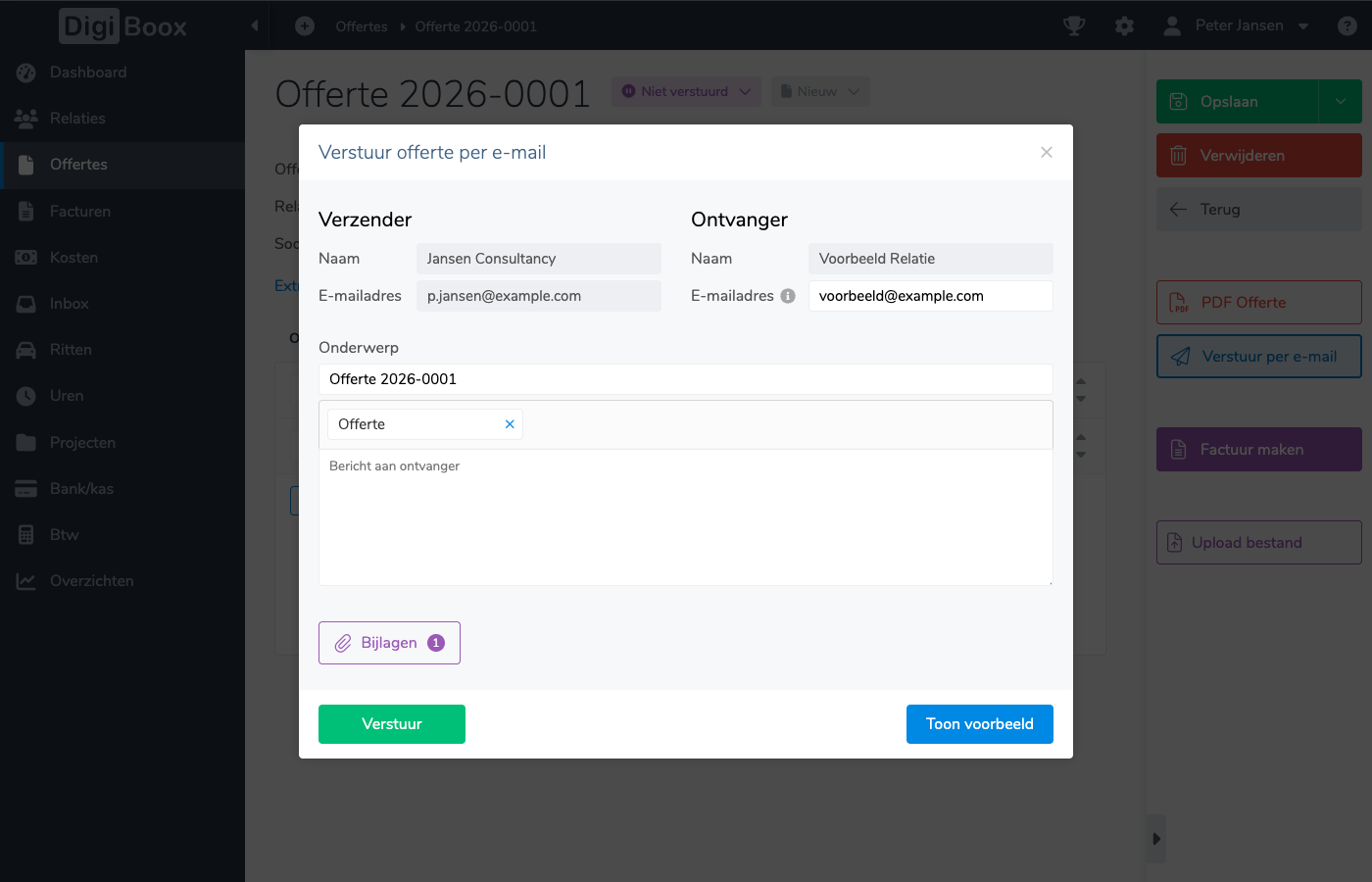 Nadat de offerte aangemaakt is, kun je deze direct vanuit DigiBoox versturen.