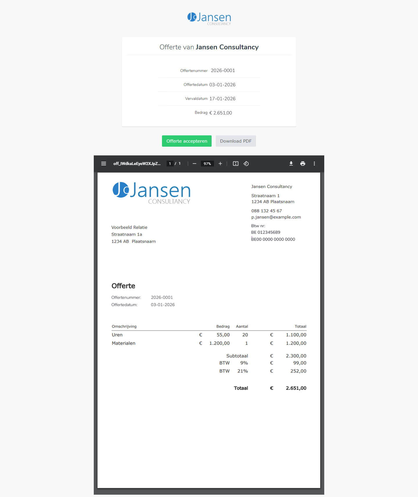 De klant kan de offerte online bekijken en ook direct online accepteren.