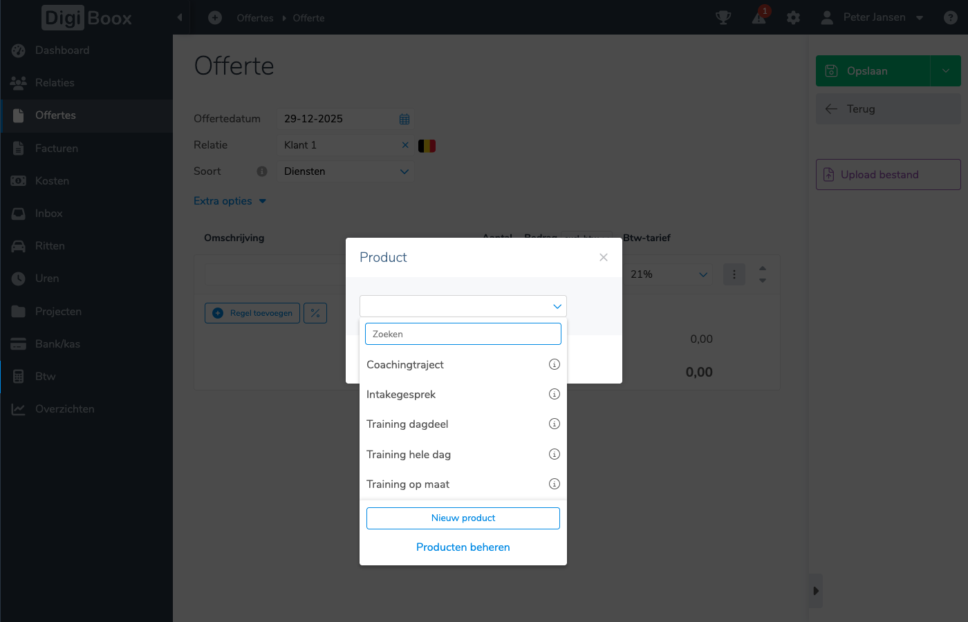 Producten, diensten en artikelen, kun je eenvoudig opslaan om bij volgende offertes te gebruiken.