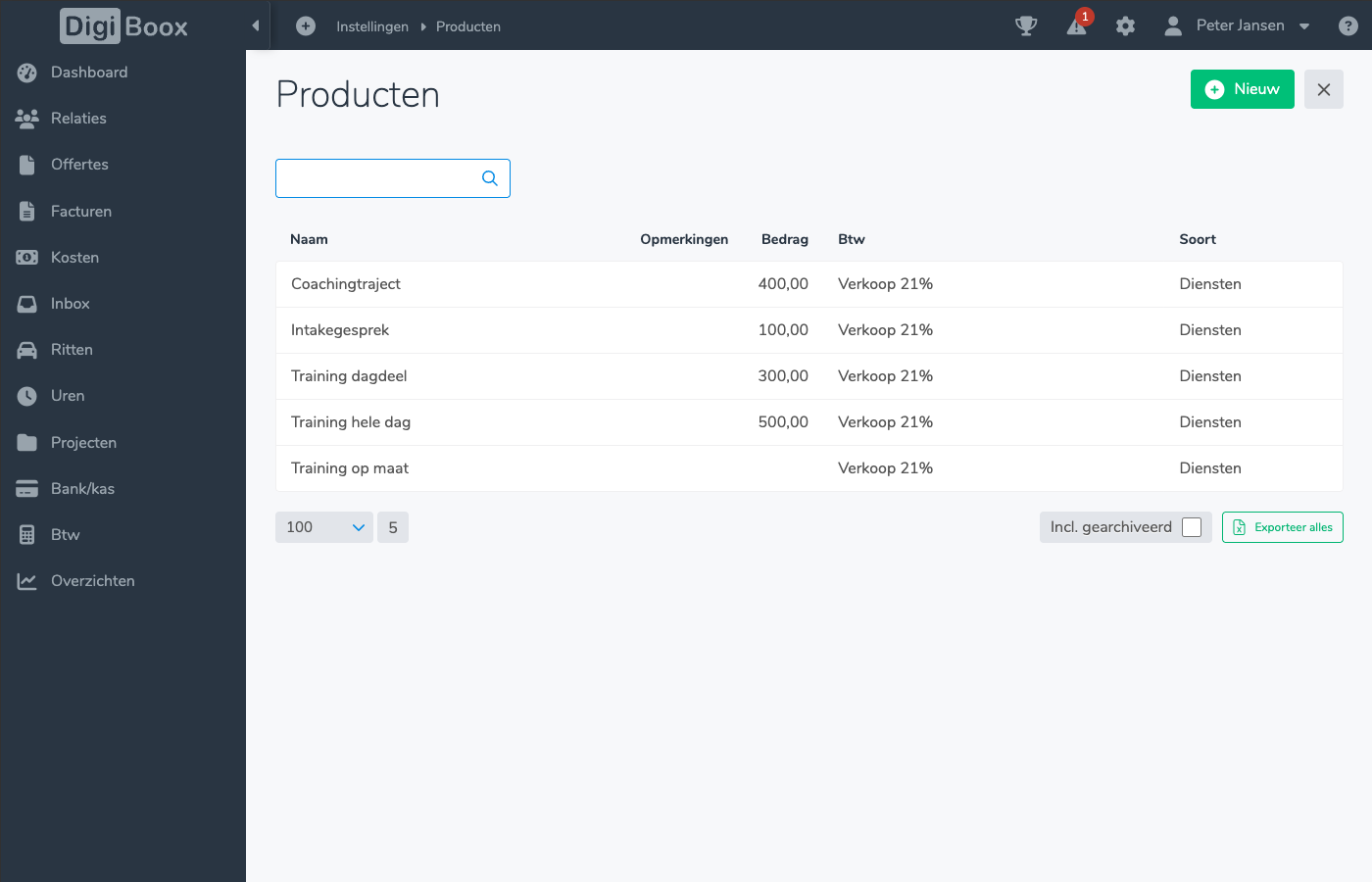 Veelgebruikte producten, goederen en diensten kunnen in DigiBoox worden opgeslagen. Bij een volgende factuur, kun je direct het product kiezen. Omschrijving, prijs, btw-percentage en bedrag worden dan automatisch ingevuld.