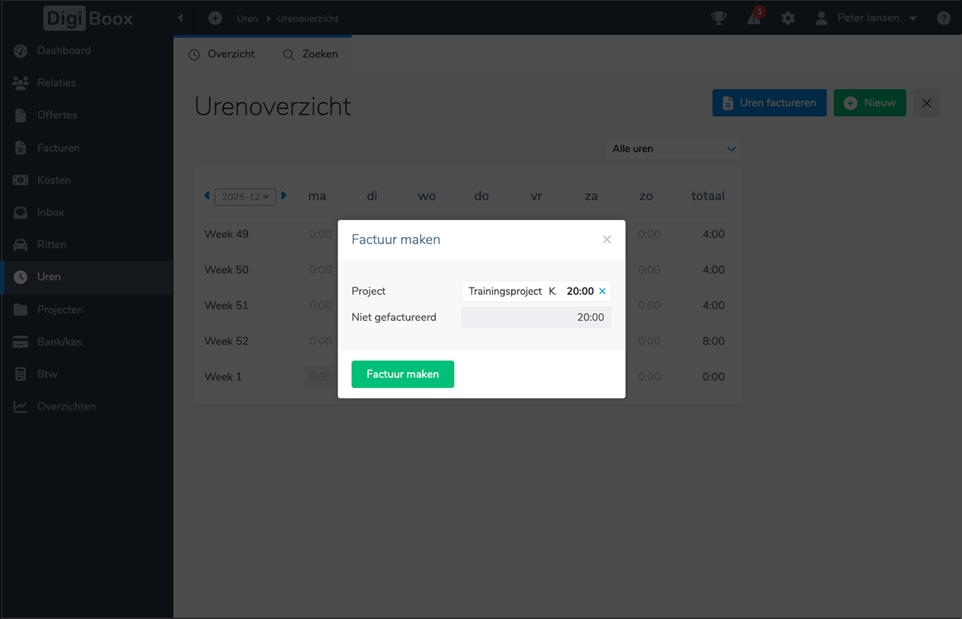 Schrijf je uren, vink aan welk project of welke uren je wilt factureren.